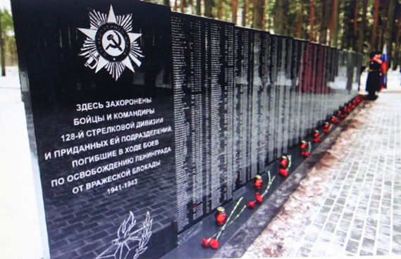 Создан на месте полевого кладбища 128-й стрелковой дивизии 2 ударной армии.