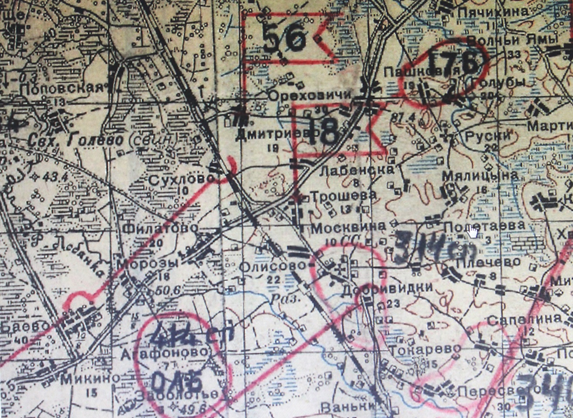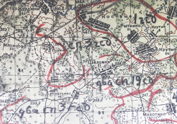 «Боевое донесение штаба 3-й гвардейской мотострелковой дивизии к 22:00 часам 15 августа 1942 года. Действующие перед фронтом дивизии подразделения противника оказывают упорное сопротивление, стараясь огневым воздействием и контратаками от роты до батальона при поддержке огнеметов сдержать наступление частей дивизии. В результате прорыва переднего края обороны и 9-ти дневных тяжелых боев с упорно обороняющимся, наполовину окруженным противником, дивизия потеряла большое количество активно действующего личного состава стрелковых рот. На 20:00 часов 15 августа 1942 года имеет активных штыков: 250 полк – 70 стрелков, 5 гвардейский полк – 190 стрелков, 6 гвардейский полк — 219 стрелков. Частными резервами в полках является только роты автоматчиков численностью 60-70 человек и роты ПТР численностью 65-75 человек. Большое количество станковых и ручных пулеметов, ружей ПТР и минометов в связи с недостатком личного состава сдано на дивизионные опорные пункты и тылы частей, вследствие чего огневая мощь пехоты значительно ослабла. Дивизия имеет более 5200 человек личного состава специалистов, которых отстранить от их работы и укомплектовать ими стрелковые батальоны не представляется возможным. Из тыловых учреждений все, что можно было изъять на комплектование рот, уже взято. Дороги в полосе действия дивизии в связи с непогодой для автотранспорта трудно проходимы, вследствие чего тылы дивизии имеют растяжку до 30 км. Снабжение частей боеприпасами, продовольствием и другими видами страшно затруднено и отрицательно сказывается на ходе операции, особенно, последние 2-3 дня. Прошу ремонт участка дороги Спас-Вилки-Крутицы обеспечить средствами армии. Вывод: наступательные возможности дивизии резко понижены. Является остро необходимым в кратчайший срок укомплектовать стрелковые роты личным составом».