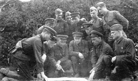 Лето 1942 года. 6 гвардейский мотострелковый полк. Нижний ряд: крайний слева – начальник штаба полка Г.В. Старовойт, третий (с циркулем в руке) – командир полка Е.С. Кузьмин, четвертый – комиссар полка Г.И. Юрасов, над ним (в фуражке, с медалью) – начальник инженерной службы П.И. Пошеченков, левее в пилотке, с усами – старший лейтенант М.С. Шавердов. Из архива М.А. Еремич.