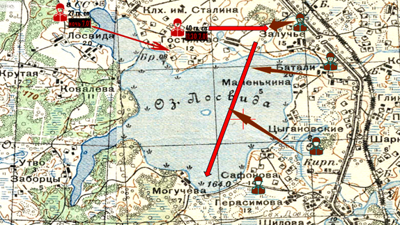 «Боевое донесение 11 Гвардейской армии. 36 Гвардейский корпус имел задачу частью сил 11 и 18 ГСД ударом через озеро Лосвида в направлении Старый Двор к рассвету 7.1.1944 захватить плацдарм на юго-восточном берегу озера Лосвида. В 1 час 20 минут 27 Гвардейский стрелковый полк (ГСП) с приданым в оперативное подчинение 58 ГСП 18 ГСД начал наступать в направлении Востренки по льду через озеро Лосвида. Не доходя 400-500 метров до юго-восточного берега озера, 27 ГСП был встречен сильным огнем пулеметов и артиллерии противника, и бойцы залегли, ведя огневой бой. 58 ГСП следовал за 27 ГСП. Обороняя южный и восточный берег озера, противник на всем протяжении установил проволочные заграждения в 1-2 кола и спираль «Бруно», лед у берега взорвал. В 12-:00 часов 7 января 1944 после артиллерийско-минометного налета подразделения 27 и 58 Гвардейских полков возобновили наступление в прежнем направлении, продвинулись вперед еще 100-150 метров и, встретив сильное огневое сопротивление противника, залегли. Определенные группы бойцов все же достигли берега в районе отметки 163-9 и закрепились на нем. Попытки полков развить успех этих групп были отбиты. Не имея поддержки и достаточных средств борьбы с численно превосходящим противником, отдельные группы в результате контратак немецкой пехоты и танков отошли с берега и присоединились к главным силам. К исходу дня оба полка отошли на северный берег. 18 Гвардейская дивизия в составе 51 и 53 Гвардейских полков (без 58 ГСП) имея задачу развить успех частей 11 ГСД с рубежа Марьяново, Старый Двор в 5часов 30 минут 7 января 1944 года начала наступление через озеро Лосвида в направлении Могучева. Противник, обнаружив движение по льду цепей наступающих, встретил их сильным пулеметным и артиллерийско-минометным огнем из районов Сафоново, Герасимово, Батали. В результате боя 51 ГСП одним стрелковым батальоном зацепился за южный берег и овладел мысом севернее Могучева. В 13:00 противник двумя ротами с 4 танками предпринял контратаку с задачей восстановить положение. Контратака была отбита. На основном участке, встретив широкие полыньи и на берегу проволочные заграждения, части успеха не имели, были вынуждены отойти на северный берег. Потери уточняются». «Журнал боевых действий 18 ГСД от 7 января 1944 года. Стрелковые батальоны, переправившиеся на южный берег озера Лосвида, от ружейно-пулеметного и артиллерийско-минометного огня противника несли большие потери и не имели возможности пополнять боеприпасы и эвакуировать раненых из-за сильного обстрела противником пути подхода к ним».
