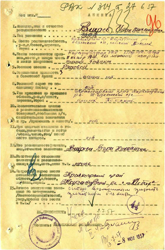 На сайте «Память народа» размещена анкета разыскиваемого военнослужащего Вихрева Ивана Михайловича, связь с которым его родственниками была потеряна во время Великой Отечественной войны 1941–1945 годов. После войны мать разыскиваемого пыталась выяснить судьбу сына, призванного в Красную Армию в 1941 году. Каратузским РВК Красноярского края 27 июня 1957 года была составлена анкета разыскиваемого военнослужащего Вихрева Ивана Михайловича, которая поступила в отдел персонального учета потерь сержантского и солдатского состава главного штаба Вооруженных Сил СССР. В анкете были указаны следующие данные. Рождение: 1923 год. Место рождения: Красноярский край, Каратузский район, Нижне-Буланский сельсовет, Польский выселок. Призван Каратузским РВК 11 ноября 1941 года, направлен в в/ч 4001. Определен 12 декабря 1941 года в 263-й лыжный истребительный батальон. Военное звание: рядовой. Должность в советской армии: данных нет. Воинский адрес по последнему письму: нет. До призыва проживал: Красноярский край, Каратузский район, Нижне-Буланский сельсовет, выселок Польский. Дополнительные данные: нет. Сведения о гибели: нет. Разыскивает: Вихрева Вера Никитична. Родственные отношения заявителя: мать. Адрес места жительства заявителя: Красноярский край, Каратузский район, село Моторск. Личное заключение военкома по материалам: считаю возможным признать пропавшим без вести. Каратузский райвоенком. Подпись. Каратузский районный военный комиссариат. Печать. Анкета поступила в отдел по учету потерь 8 июля 1957 года. На следующий день было принято решение учесть красноармейца Вихрева Ивана Михайловича пропавшим без вести в марте 1942 года. Извещение об этом было выслано в Каратузский РВК 13 июля 1957 года, где его получила мать воина Вера Никитична Вихрева. Следует уточнить некоторые данные анкеты Вихрева Ивана Михайловича. Место рождения: Польский выселок, Верхне-Буланский сельсовет, Моторская волость, Минусинский уезд, Енисейская губерния. До призыва проживал: Польский выселок, Верхне-Буланский сельсовет, Каратузский район, Красноярский край.