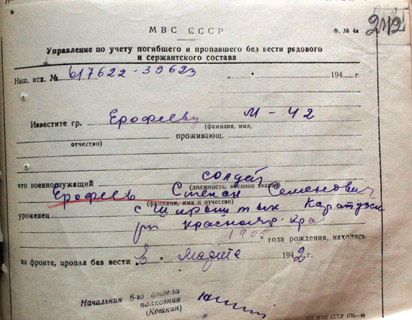 Рождение 1905 год село Ширыштык Моторской волости Минусинского уезда Енисейской губернии. Русский. Призван в Красную армию Каратузским РВК 18 августа 1941 года село Ширыштык одноименный сельсовет Каратузского района Красноярского края. Рядовой. ВУС-1. Помещение для накопления – учебный пункт Каратузский районный военный комиссариат (РВК). Начальник команды  – лейтенант запаса Устинов. Готовность команды к отправке  — 18 часов. Каратузским РВК команда №600 в составе 107 военнообязанных отправлена в Минусинский районный военкомат. Порядок следования: на автомашинах маршрут Каратуз – Минусинск. Писем не было. По запросу Каратузского РВК от 28 мая 1947 года Управление по учету погибших и пропавших без вести Министерства обороны СССР сообщило, что красноармеец Ерофеев Степан Семенович учтен пропавшим без вести в марте 1942 года. Извещение в Каратузском РВК получила жена воина Матрена Ерофеева, проживавшая село Ширыштык одноименного сельсовета Каратузского района Красноярского края.